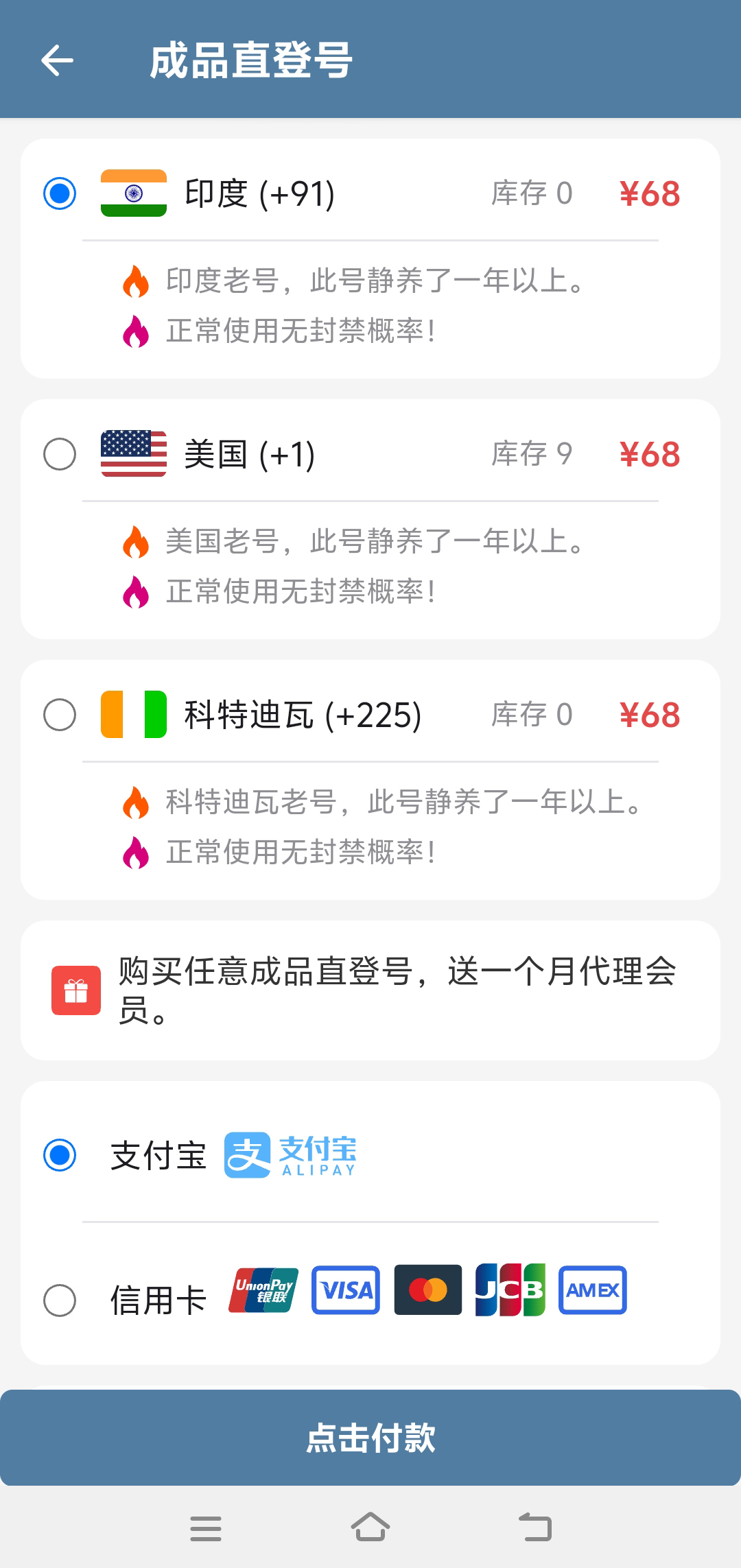 第3步:选择有库存的国家号码进行购买